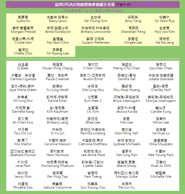 富邦LPGA台灣錦標賽參賽選手出爐!!OCT 22-25 Fubon LPGA Taiwan Championship